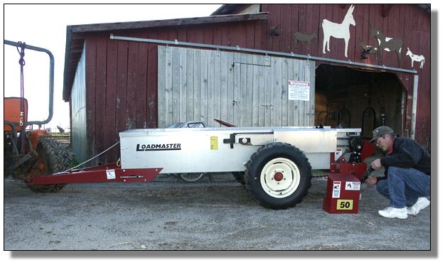 Here is our manure spreader. Our manure is picked up daily and spread on the back of our property where no donkeys are kept.This new larger manure spreader was purchsed in 2004.