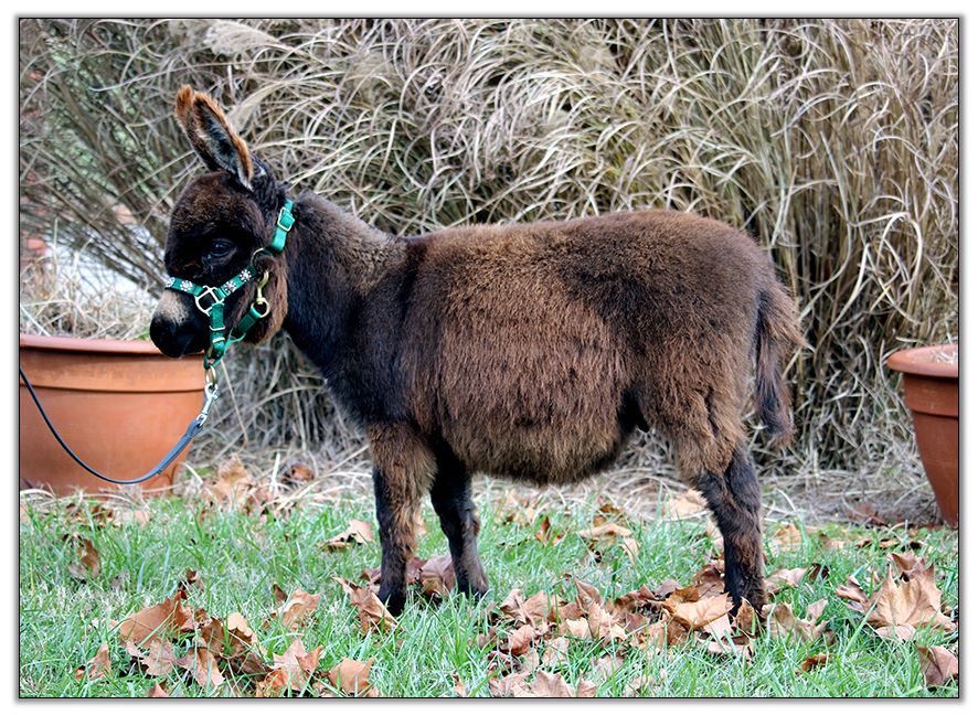 This handsome little boy just arrived at Half Ass Acres. Petey is up to date on all vaccinations including Tetanus, Eastern/Western Encephalitis, Rhino, Influenza and Rabies. He has had his initial vaccination plus his booster one month later so he is good for one year on his vaccinations. He has a current negative coggins report. His hooves have been freshly trimmed and he has been dewormed four times. He has been microchipped and his registration papers are back and in order and the transfer will be ready to be mailed off in your name. You will recieve a hard cover book with all of Petey's records including care instructions, an exclusive Half Ass Acres T-shirt and ballcap along with other extras that will look great wrapped under the tree. Petey has a dilute gray/navy eye color that really makes him special. We expect him to mature somewhere between 30" to 31" tall at maturity. He is registered as black with a cross but, in my humble opinion, he is a very dark brown. No matter what color.... he is tiny and precious.