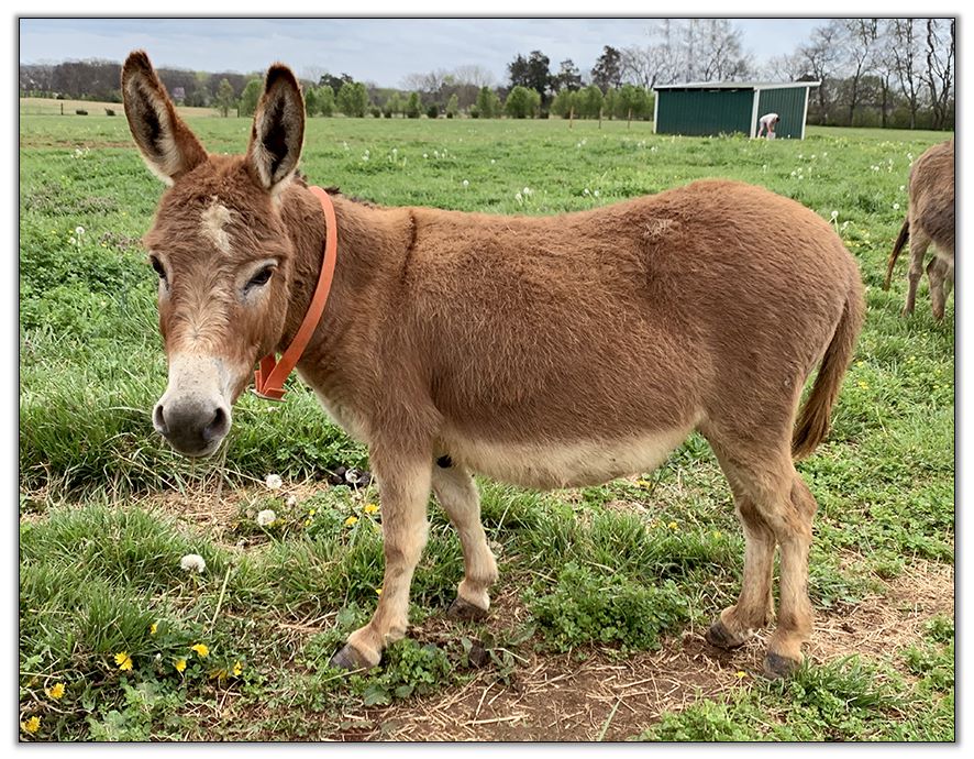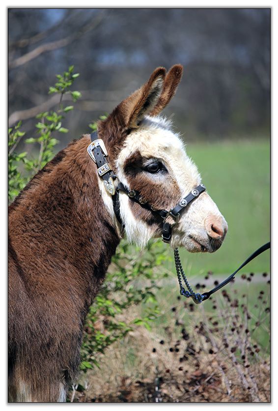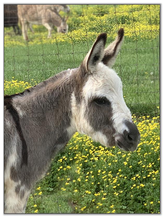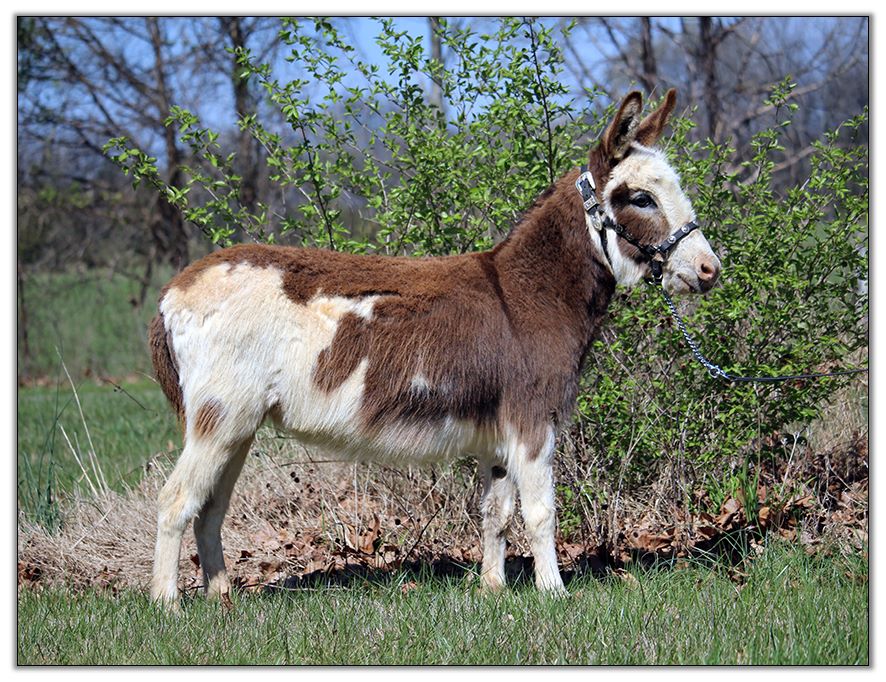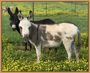 Butters is also a super friendly jennet. She is up to date on all vaccinations including Eastern/Western Encephalitis, Tetanus, Rhino, Influenza, Rabies and West Nile. She has a negative coggins report dated 7/08/19. She has been regularly de-wormed. She has just been a pet her entire life but she can certainly be used for a brood jennet if you so desire. She has not been registered but I am applying for her registration to the American Donkey & Jackstock Registry although her pedigree is unknown. She will also be registered with ACOSA (American Council of Spotted Asses). She has been microchiped. Butters will be able to compete in any National Miniature Donkey Show and/or American Council of Spotted Asses classes as well.